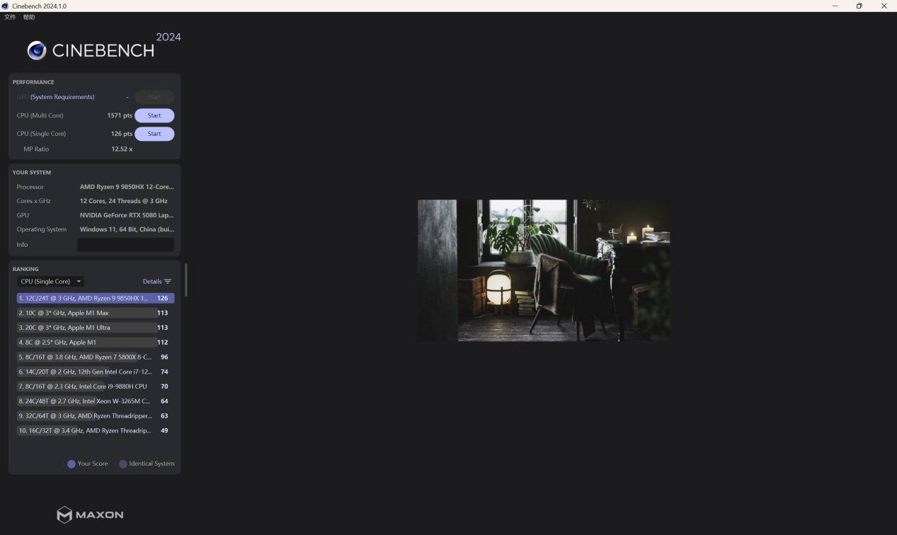 在CINEBENCH 2024中,单核性能126pts,多核性能1571pts;