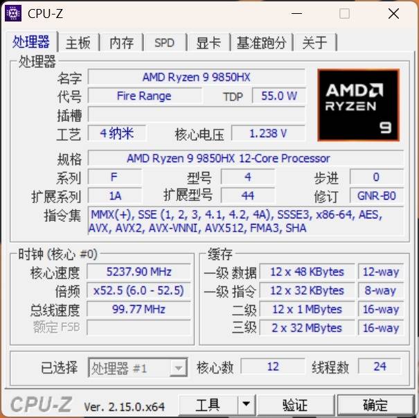 首先是CPU,AMD锐龙9 9850HX,最新一代Zen5核心架构,TSMC 4nm FinFET工艺,双CCD设计,共12核心24线程,三级缓存共64MB,基础频率3.0GHz,至高5.2GHz,TDP 55W,集成2Cu的Radeon 610M核显。