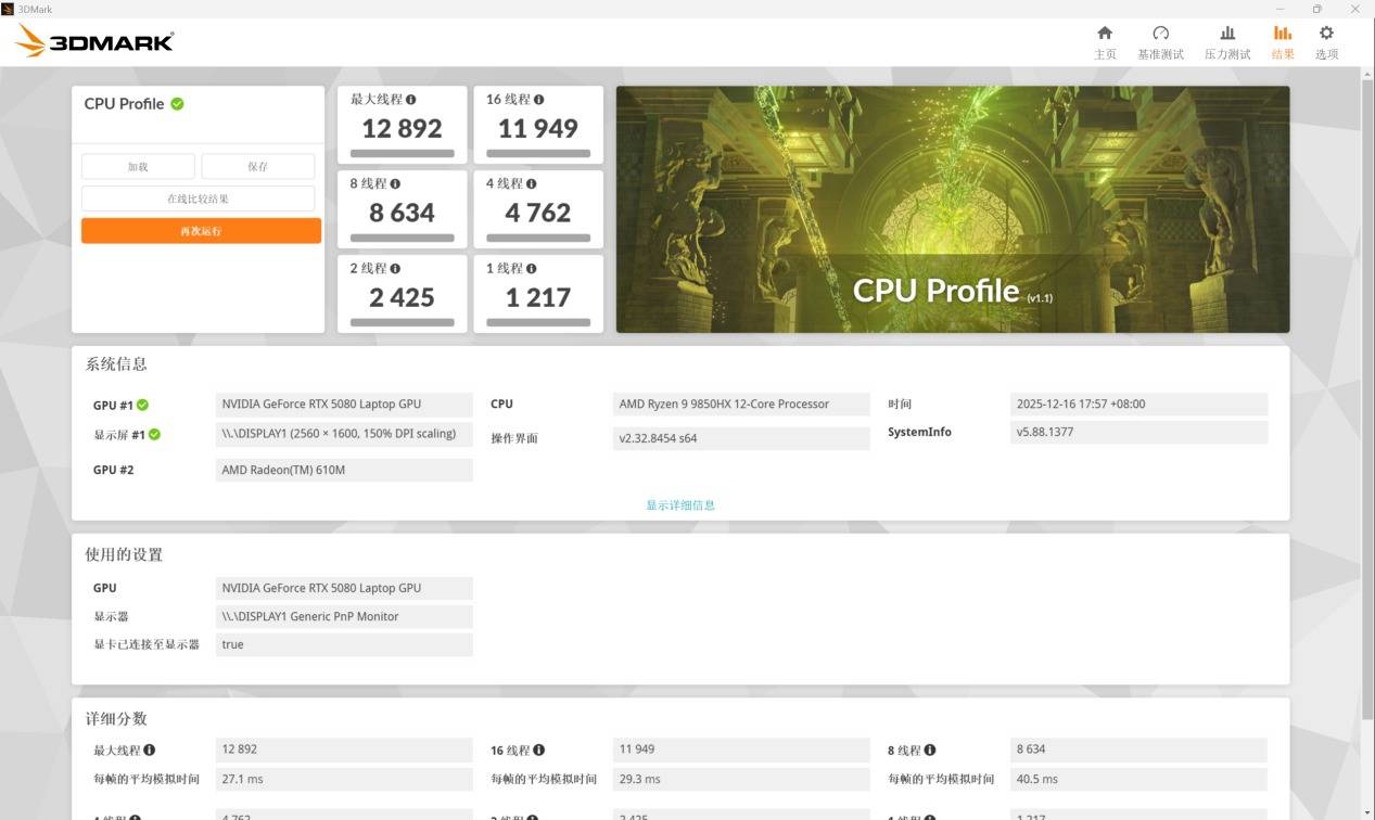 在3DMark Profile中,单线程性能1217,最大线程性能12892。