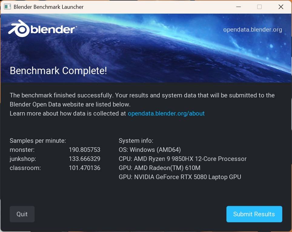 同时我们也测试了在渲染软件V-Ray BenchMark和Blender BenchMark中的性能表现,在选择使用CPU纯物理运算的情况下,在V-Ray BenchMark中性能得分:32953vsamples。