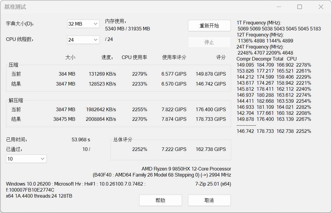 在更看重缓存、多核能力、内存性能表现的解压缩和压缩场景下,在7-Zip BenchMark中,选择32MB字典大小,压缩评分为146.742GIPS、解压缩评分178,733GIPS,总评分162.738GIPS。