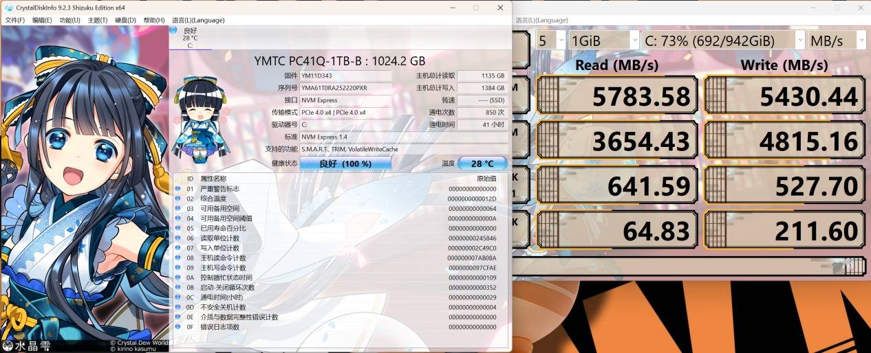 在CrystalDiskMark中,这块1TB YMTC PC41Q的最大读取速度5783MB/s、最大写入速度为5430MB/s。(*由于测试时间较为紧迫,测试硬盘时为脏盘状态下进行的)。