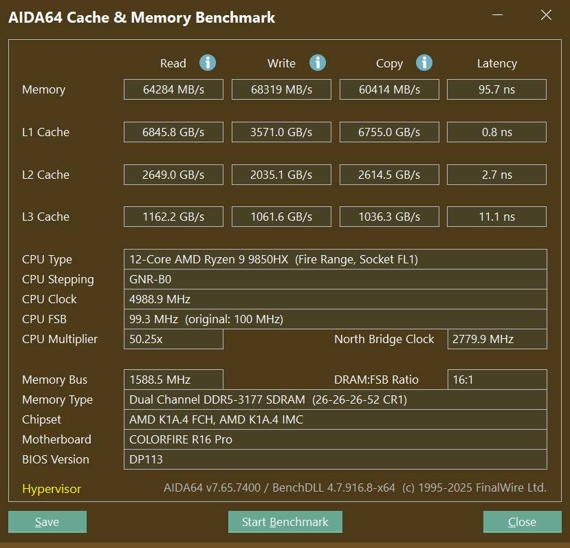 使用AIDA64 Cache&Memory BenchMark,内存的读、写、复制速度分别为64284MB/s、68319MB/s、60414MB/s,延时95.7ns。