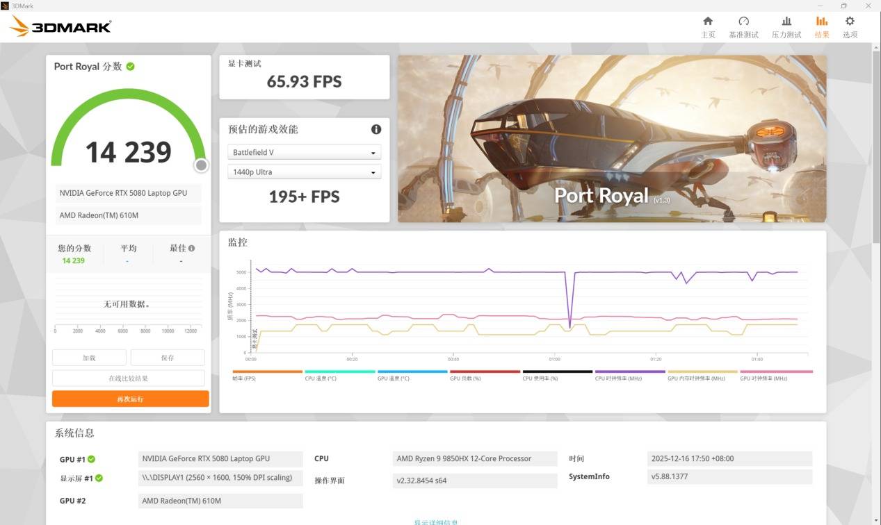 代表光线追踪性能的Port Royal测试得分14239分。