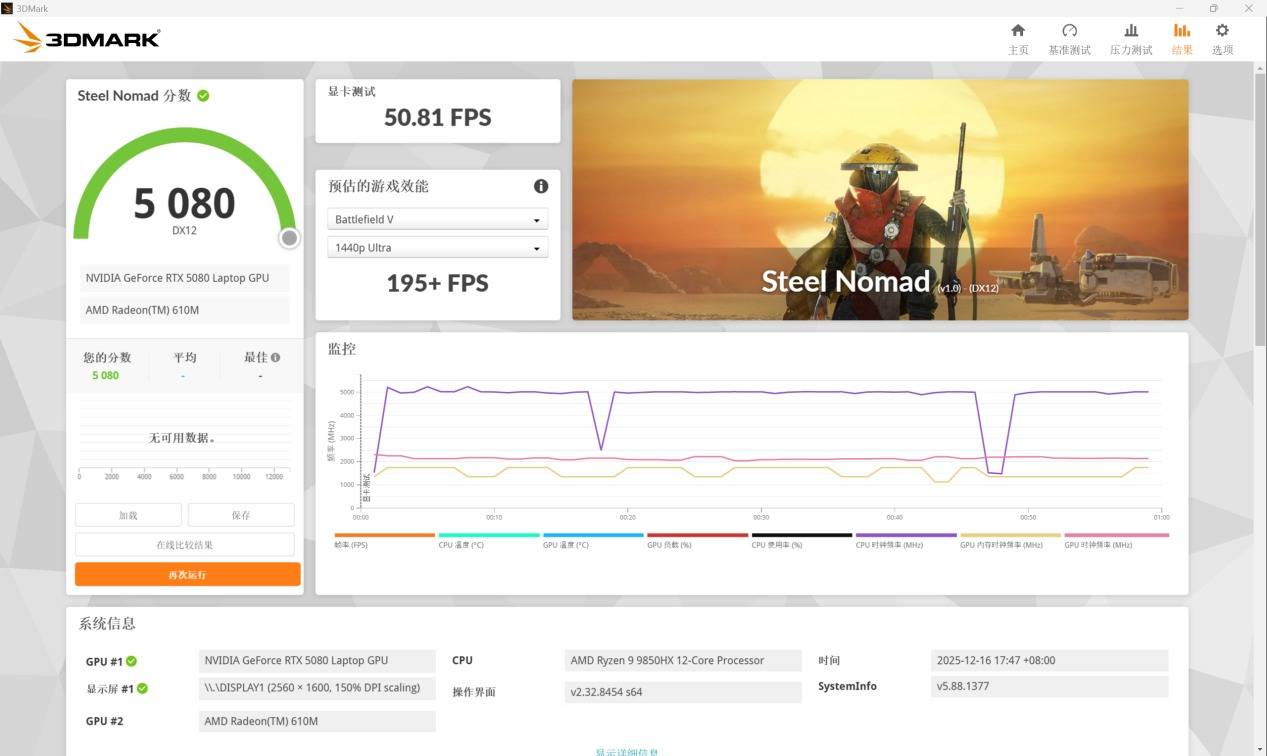 在相比Time Spy负载更高、调用DX12和Vulcan API的Steel Nomad测试中得分5080分。