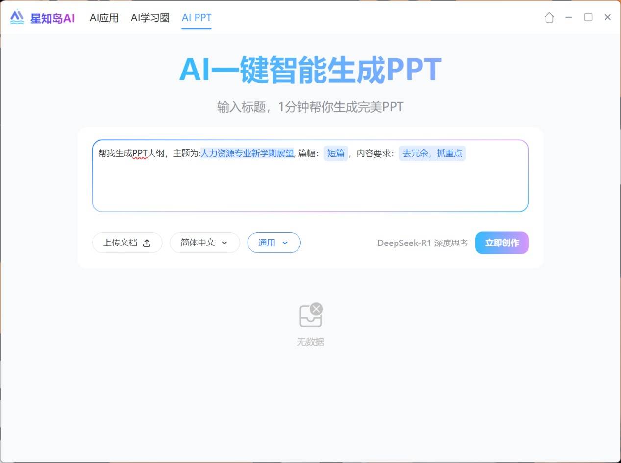 AIPPT则是可以一键生成PPT,通过一段文字描述便可以自动完成从大纲至完整PPT导出的全流程。比如在这里我先给出一段描述,AIPPT便可以先行生成符合该描述的大纲,大纲可以进行自行修改。