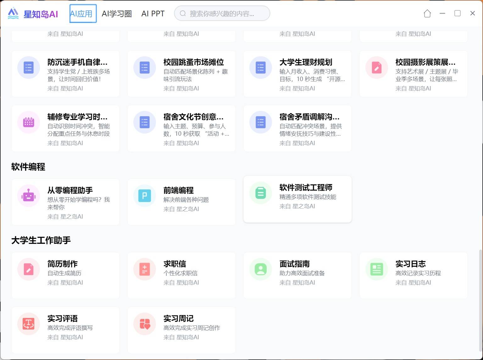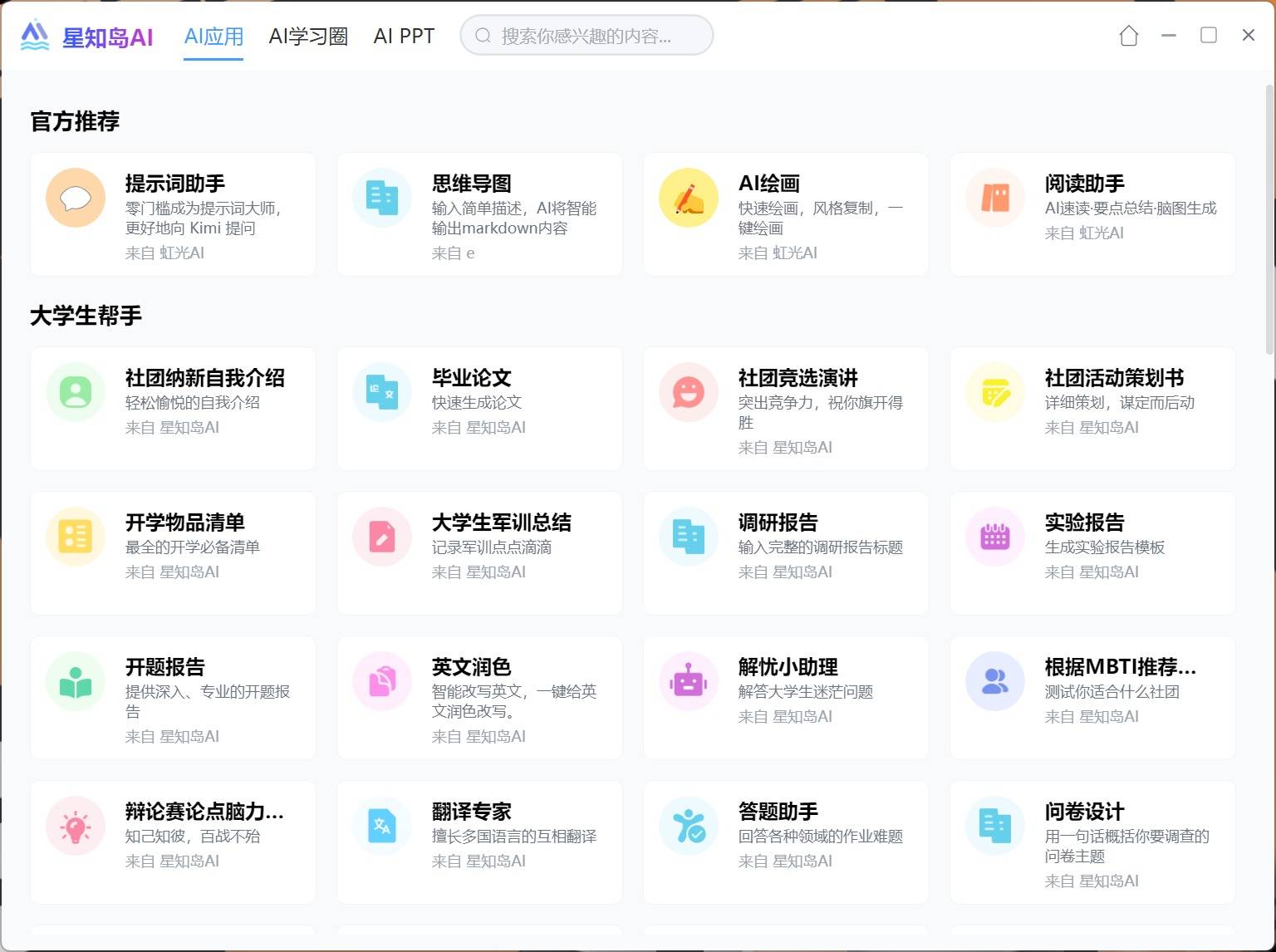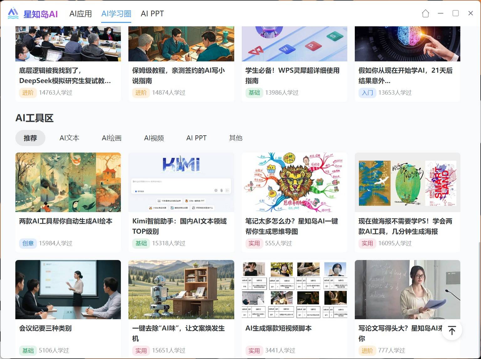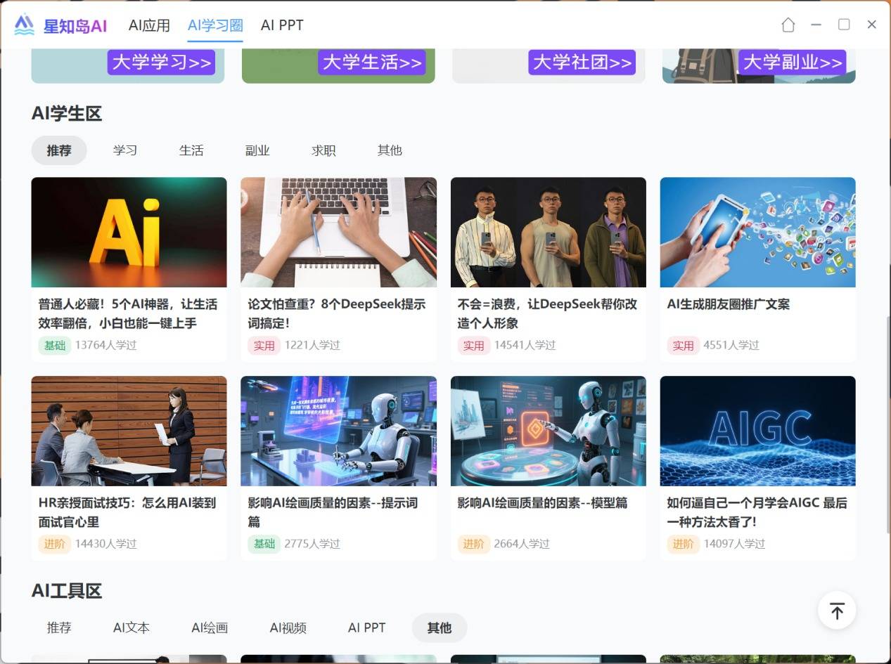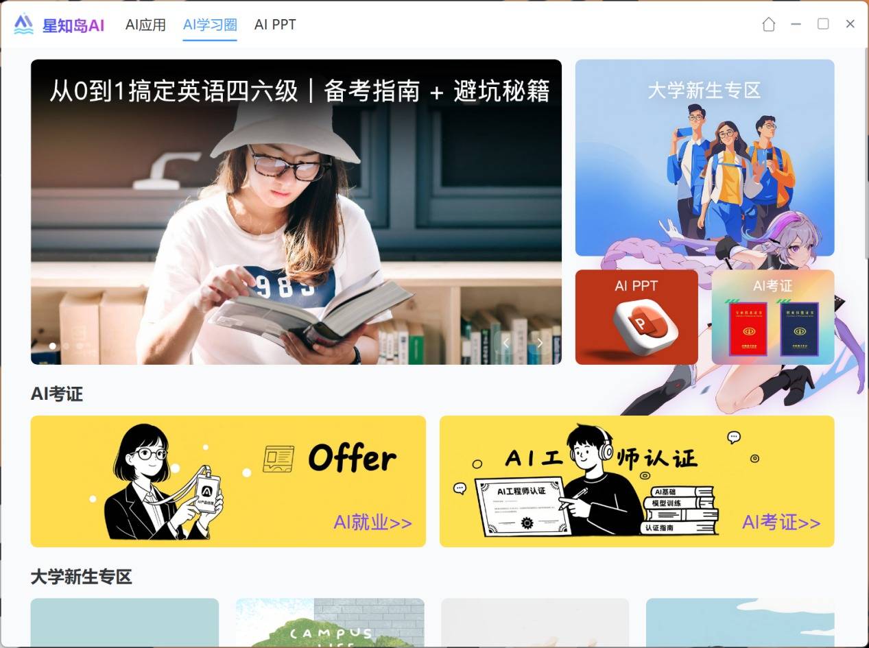 更新主要新添了两大板块,AI学习圈与AIPPT。AI学习圈为大学生群体及打工人提供了各类型的AI教程,帮助提升学习与工作效率。