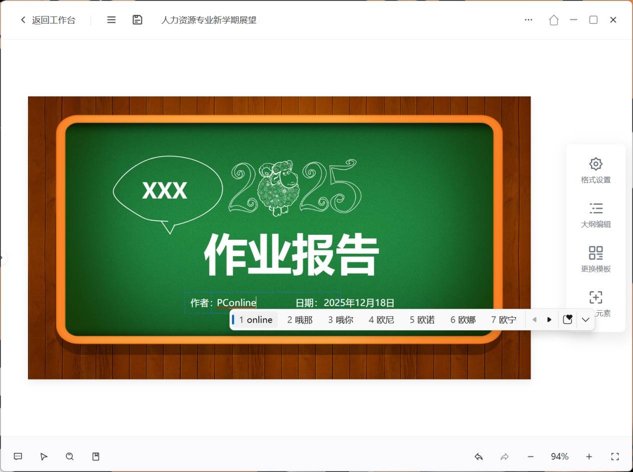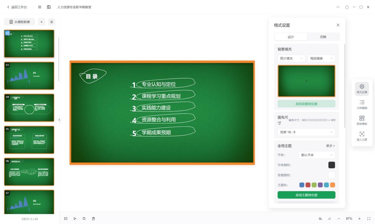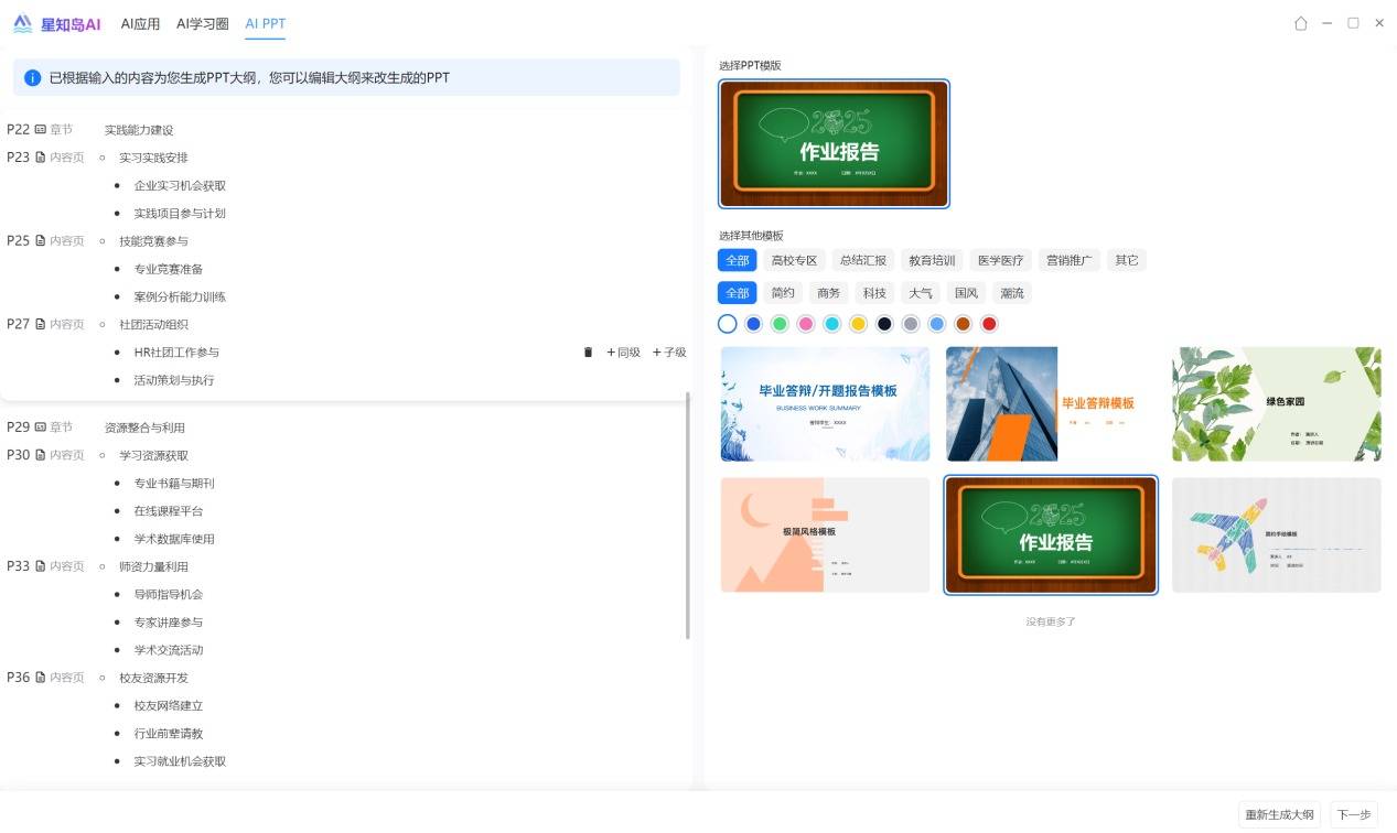 之后在右侧选择模板,便可根据大纲自动生成PPT初稿。
