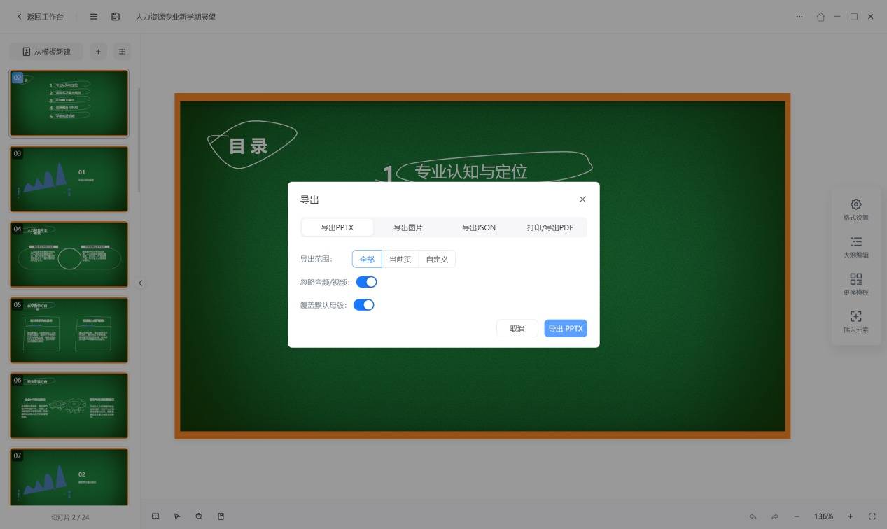调整好后,可直接输出为PPTX、PDF、图片等格式的文件,甚至可导出JSON。