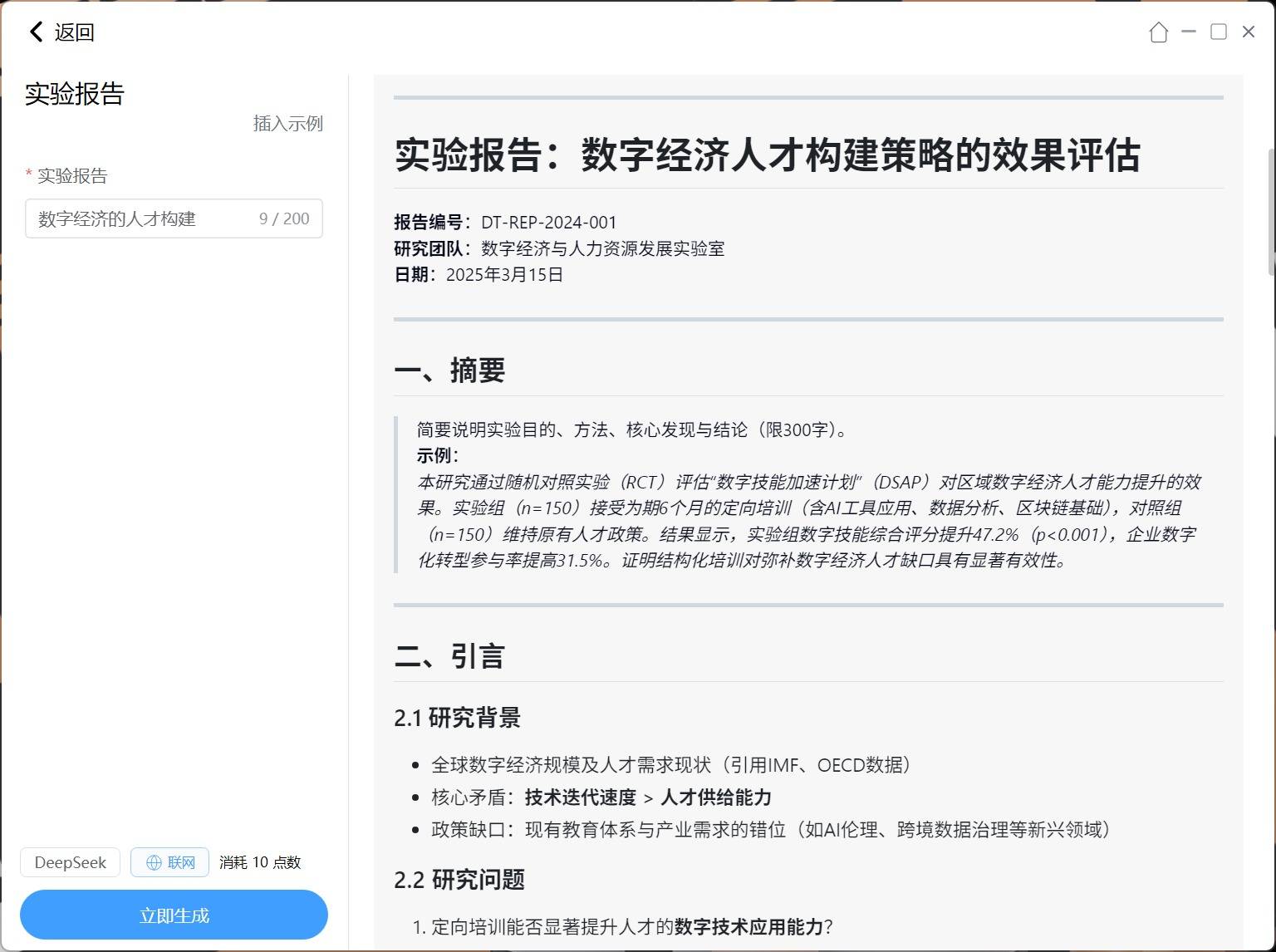 以及非常多的场景化AI细分功能,比如我这里使用“实验报告”功能让AI生成了一份有关“数字经济的人才构建”的实验报告。