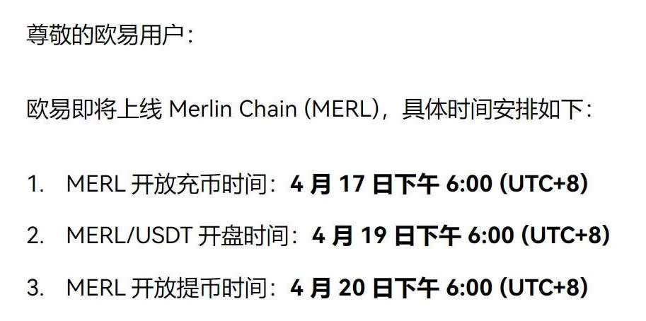 据欧易官方信息显示,MERL币已于4月17日下午6点开放充币,并于4月19日下午6点开放开盘,4月20日下午6点开放提币。