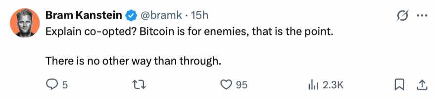 Melker 认为,比特币虽然很特别,但它在某种程度上,已经被那些最初想要对抗的人所利用了。虽然他自己并不完全认同这些观点,只是想“指出”他所听到的情况,但这仍然引发了关于比特币被机构采用后,对其原始理念的影响的讨论。
