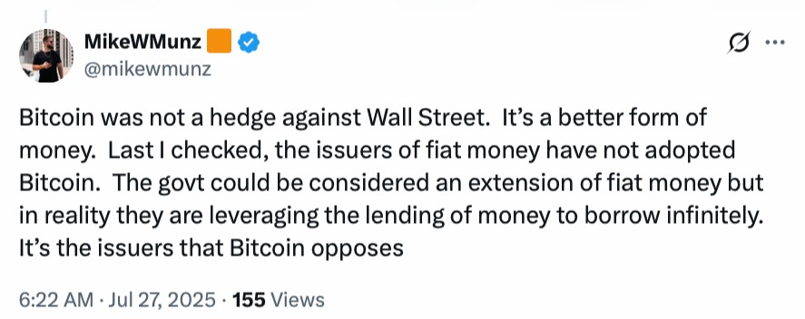 与此同时,比特币的支持者 Dave Weisberger 指出,如果没有机构的参与,比特币根本不可能被广泛采用:“讽刺的是,如果没有控制法币系统的传统机构的采纳,以及元老持有的比特币向这些实体的分配,比特币标准根本无法实现。”