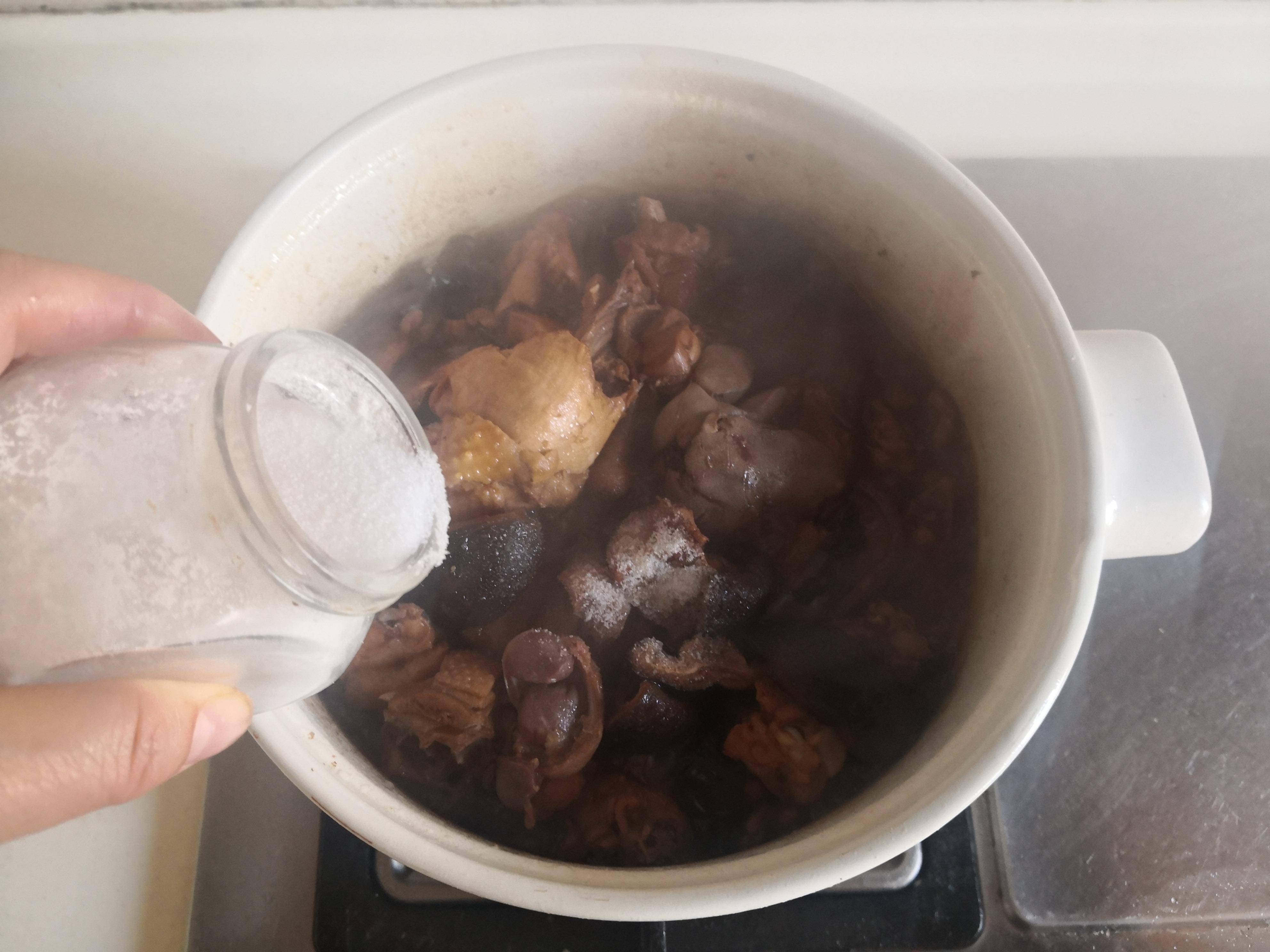4. 倒入泡香菇的水, 加盖焖煮30分钟至鸡肉九成熟;