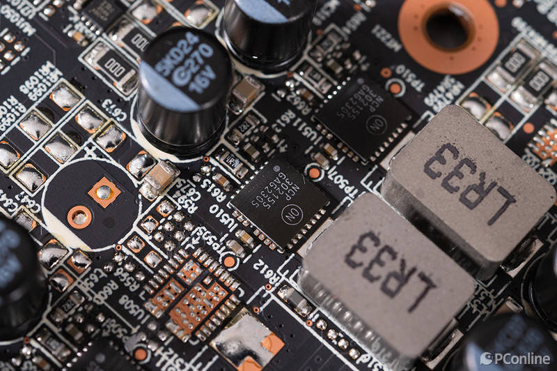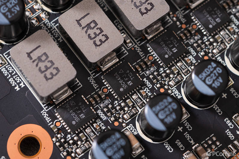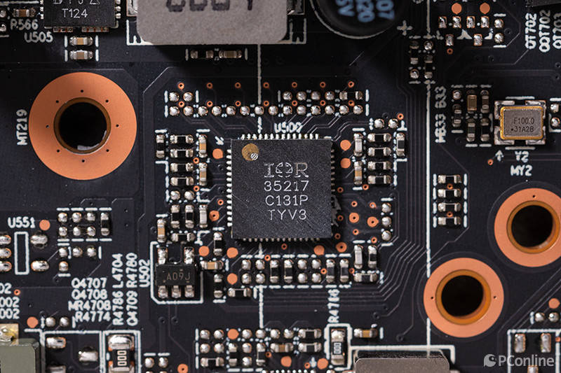 核心供电由IR35217 PWM芯片控制,每相核心配备一颗SiC649A DrMos,单颗最大电流为60A。