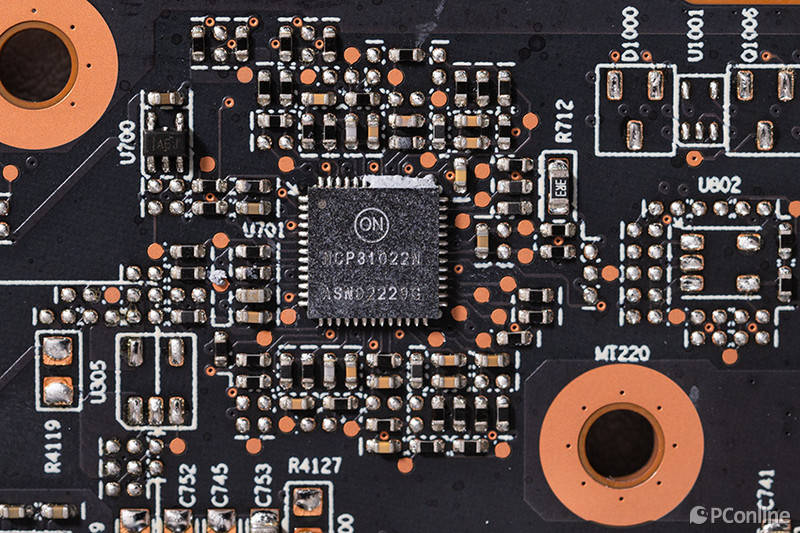 显存供电由安森美NCP81022 控制,每相显存配备一颗NCP302155 DrMOS,单颗最大电流为55A。
