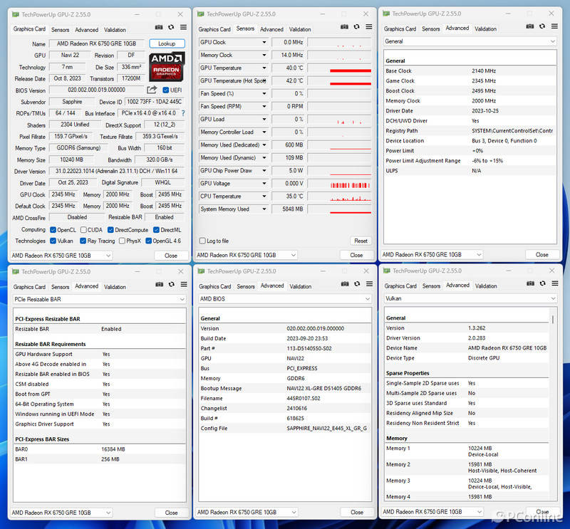 上机测试前还是按照惯例,在GPU-Z中看看这款显卡的信息。在GPU-Z中可以看到这款显卡采用的是Navi 22核心,显卡基准频率为2345MHz,Boost频率可以达到2495MHz。除此之外,在GPU-Z中还可以看到此时主板的Resizable BAR功能已开启,显卡能够最大限度的发挥出其全部性能。