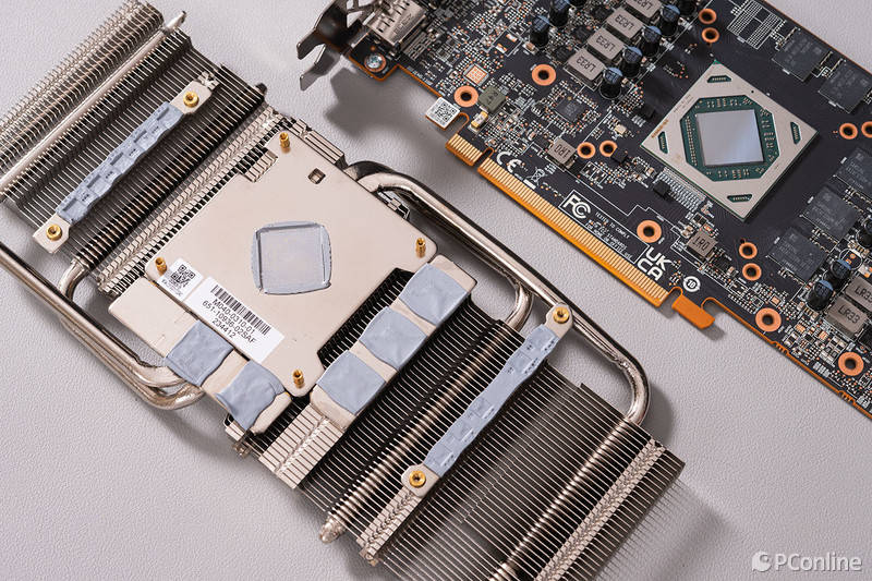 再来看看这款显卡的散热系统,不得不说这款显卡的散热堆料是真的足!像显存、电感部分都覆盖了高导热系数的导热垫,核心处的硅脂也是厚厚的一层。