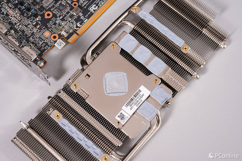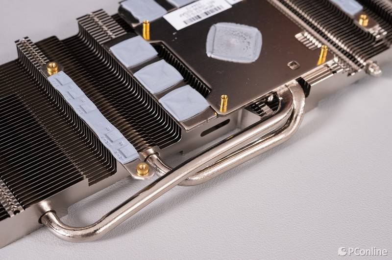 拉近看细节,整个散热器上最瞩目的就是中间的纯铜底座了,直触GPU核心与显存核心,有利于核心、显存双双散热,显卡的性能得到充分释放。