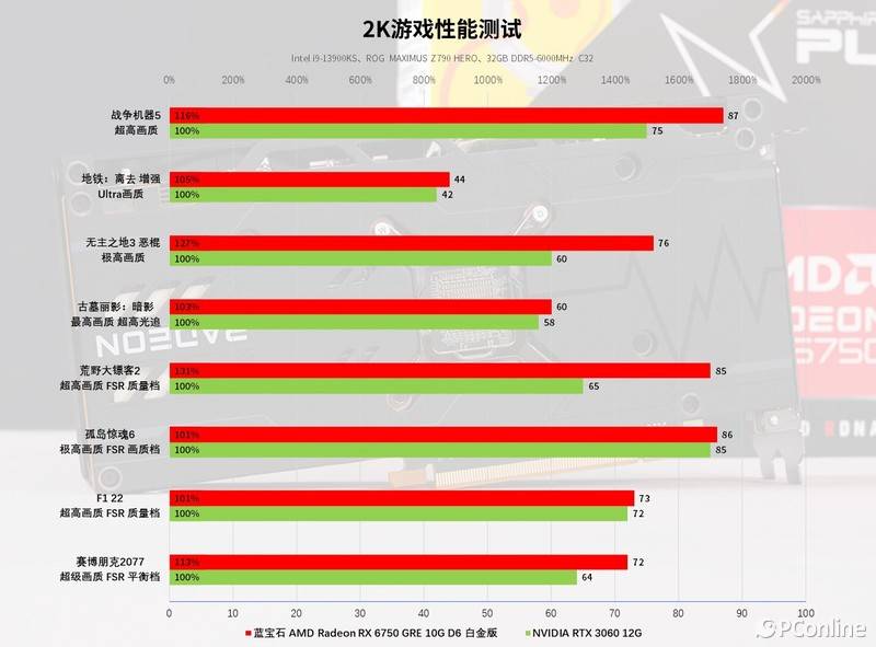2K分辨率下同样出色,蓝宝石RX 6750 GRE 10G D6白金版在不少游戏中依旧能够领先RTX 3060达20 FPS以上。像经典的3A大作《无主之低3》,76 FPS的表现远比RTX 3060的60 FPS要高得多,换算成百分比,领先足足有27%之多。