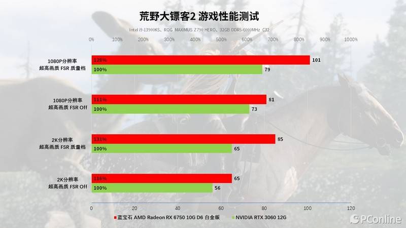 我们再关注一下另一款3A大作《荒野大镖客2》,这里蓝宝石RX 6750 GRE 10G D6白金版的优势更大,即使不开FSR,2K下依旧可以保证60+FPS以上的游戏体验,反观RTX 3060,还无法达到60 FPS,如果蓝宝石RX 6750 GRE 10G D6白金版开了FSR,游戏性能已经可以去到85 FPS,对比RTX 3060的话,性能优势足足30%之多。1080P也差不多,开关FSR后,游戏帧数的差距可以去到20 FPS以上,所以如果你玩的游戏支持FSR,那我还是建议你开启使用。