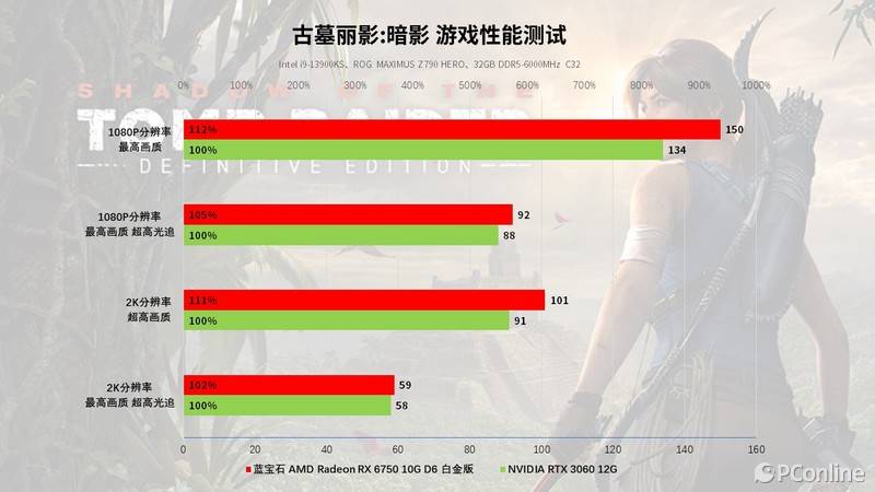 最后看看老牌的3A大作《古墓丽影:暗影》,不过比较遗憾的是这款游戏中没有FSR,但蓝宝石RX 6750 GRE 10G D6白金版的表现依旧亮眼,不开光追的情况下,1080P下比RTX 3060强12%以上,2K也有10%以上的领先,即便是开了光追,蓝宝石RX 6750 GRE 10G D6白金版也是遥遥领先!