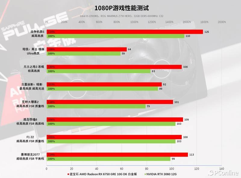 综合来看,蓝宝石RX 6750 GRE 10G D6白金版完全能够胜任1080P分辨率,这个分辨率下绝大多数游戏都能跑到100+ FPS,这样的表现已经能够满足不错的电竞体验了。相比RTX 3060来说,蓝宝石RX 6750 GRE 10G D6白金版平均能领先10%以上。