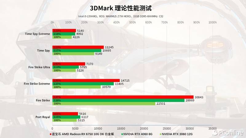 接下来就该正式开始测试了,首先进行的是3DMark的理论性能测试。从测试成绩就可以看出蓝宝石RX 6750 GRE 10G D6白金版的性能释放还不错。本以为它应该跟RTX 4060不相上下,没想到它的表现基本碾压RTX 4060。在DX12 Time Spy测试中,这张显卡以11245分领先了RTX 3060 20%,相比RTX 4060也有5%以上的领先优势。如果换到DX11的Fire Strike测试,它的成绩更加离谱,比RTX 4060强10%以上,相比RTX 3060,优势更是扩大到30%以上,实力相当强劲。