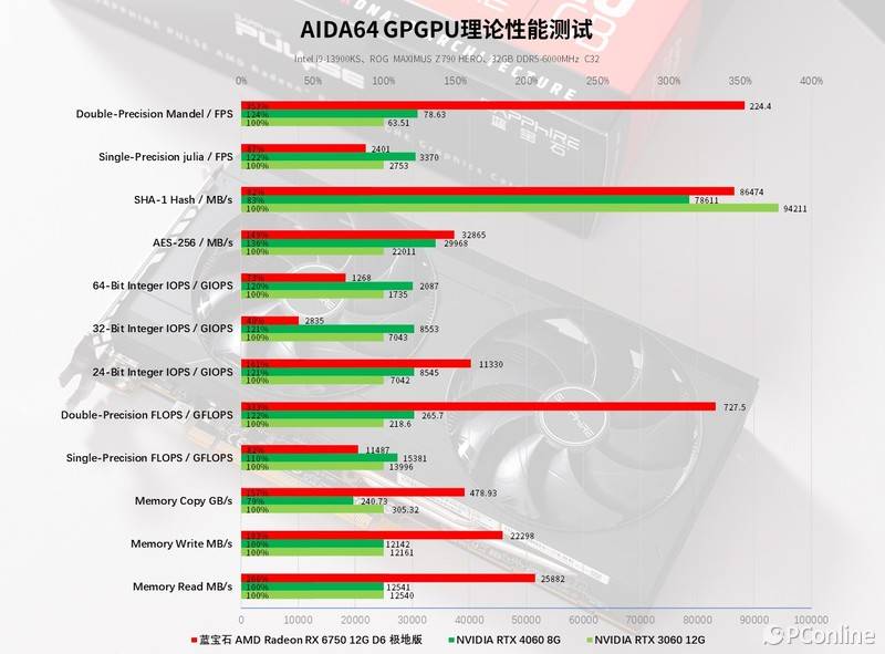 理论性能的最后我们再进行科学计算测试,我们这里采用AIDA 64的GPGPU进行,该项测试可以知道显卡在物理计算、加密解密、科学计算以及比特币等领域的性能。实测下来,不得不说蓝宝石RX 6750 GRE 10G D6白金版确实优秀,160bit的显存带宽带来了更极致的读写复制性能,看下面的Memory Test部分就知道了,几乎是两张N卡的两倍有多。