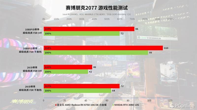 直接上硬菜,《赛博朋克2077》启动!开启超级画质,不开FSR技术下,这张显卡的帧数在1080P和2K分辨率下分别是86 FPS和46 FPS,1080P下可玩,而2K则还无法流畅运行。如果开启FSR后,可以看到此时的RTX 3060在2K下仅做到60 FPS左右,而蓝宝石RX 6750 GRE 10G D6白金版已经可以达到72 FPS,当然如果这时有FSR 3,那相信这款显卡的性能还能更上一层台阶。如果是1080P分辨率,那开了FSR后,甚至有望去到120 FPS,满足一定的高刷体验。