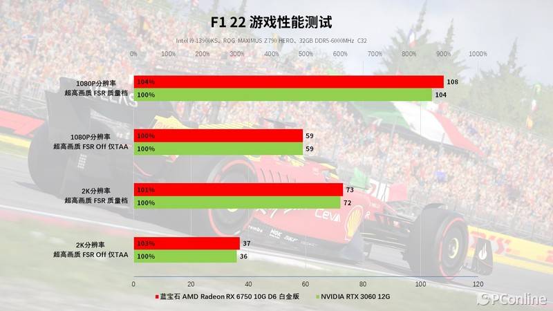 在《F1 22》中两款显卡的差距就有些小了,这也是得益于《F1 22》的出色优化,1080P下蓝宝石RX 6750 GRE 10G白金版开启FSR后差点就摸到120 FPS的高刷门槛了,如果是压力比较大的2K分辨率,这款显卡也有73 FPS的表现,如果你将FSR调整至平衡档或性能档,2K@90Hz驰骋赛道绝对有可能。