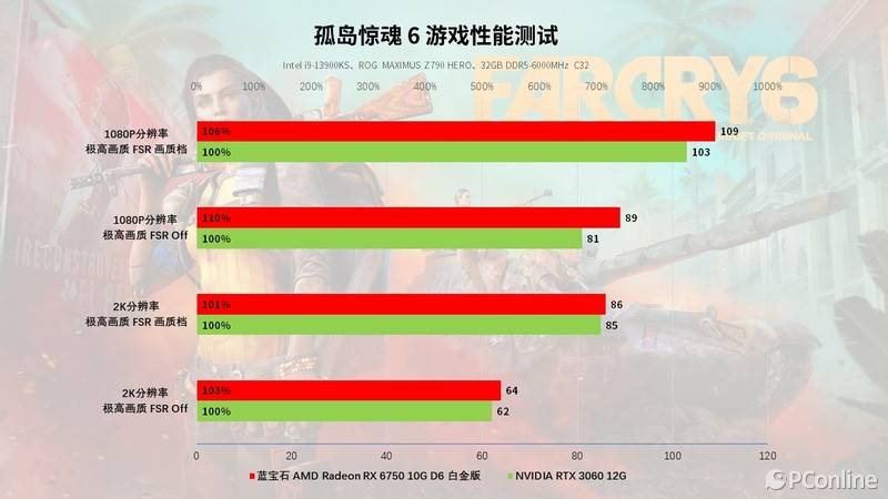 下一款,我们看看有着AMD Logo的游戏《孤岛惊魂6》,蓝宝石RX 6750 GRE 10G D6白金版在1080P下的表现比RTX 3060更为出色一些,开启FSR后,1080P画质下可以去到109 FPS,比RTX 3060强6%左右,2K下不开FSR仅有60 FPS左右,一旦开了FSR,游戏帧数直接涨20 FPS,可见这款显卡的2K游戏实力确实强悍。
