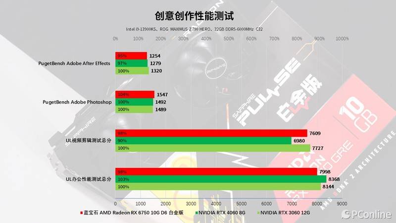 在更为专业的PugetBench中,我们的蓝宝石RX 6750 GRE 12G D6极地版在Photoshop测试里获得了1547分的成绩,直接领跑全场,领先隔壁的RTX 4060和RTX 3060达5%左右,而在Ae中,几款显卡的表现则基本相近。