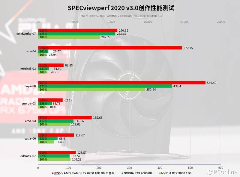 而在工业软件上,蓝宝石RX 6750 GRE 10G D6白金版可谓占尽天时地利人和,全方位的碾压隔壁两张N卡,不少项目领先RTX 3060甚至RTX 4060达2倍以上!甚至在snx-04项目上,蓝宝石RX 6750 GRE 10G D6白金版的性能足足是RTX 3060的20倍左右!