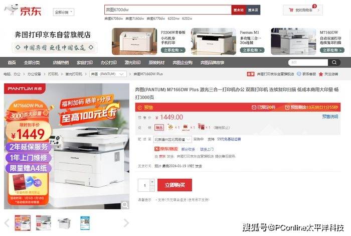 随着办公智能化推进、办公方式多元化发展,用户对打印设备的使用体验有了更高的要求。1月5日,国产打印厂商奔图在京东全球首发了两款激光打印机新品,分别为M6766DW Plus和M7166DW Plus。在京东参加预售的首发用户不仅可先人一步锁定新品,还能够享受京东独家提供的首发价格直降、30天免费试用、2年延保赠送等多重首发福利。其中,奔图打印机M6766DW Plus首发价格直降400元,预售1149元即可入手,还享30天免费试用、赠送2年延保;奔图M7166DW Plus首发价格直降350元,预售1449元即可入手,除2年延保外还加赠1年上门维修服务。