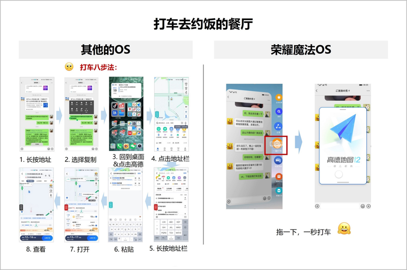 同样的思路我们可以在荣耀即将发布的MagicOS 8中看见端倪,依仗大模型,其平台级AI可以精准识别用户意图,进而推荐对应的APP服务,为用户带来更加便捷的交互体验,荣耀称其为“流转任意门”。举个例子,当你需要打车时,你需要打开微信、复制地址、关闭微信、打开滴滴,将地址粘贴才能成功打车,而通过“任意门”,你只需要把地址的文字信息直接拖动至侧边栏的地图类 App,就可以开启相应路线的导航,省去了很多繁琐的操作步骤。