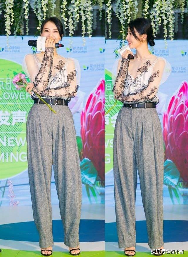 高圆圆的这款上衣还是比较有设计感的,上边黑色刺绣的图案也很有质感,配灰色的宽松长裤,一整套造型非常有职业女精英的味道,上班穿很合适,但是这套造型对体重也有很严格的要求。