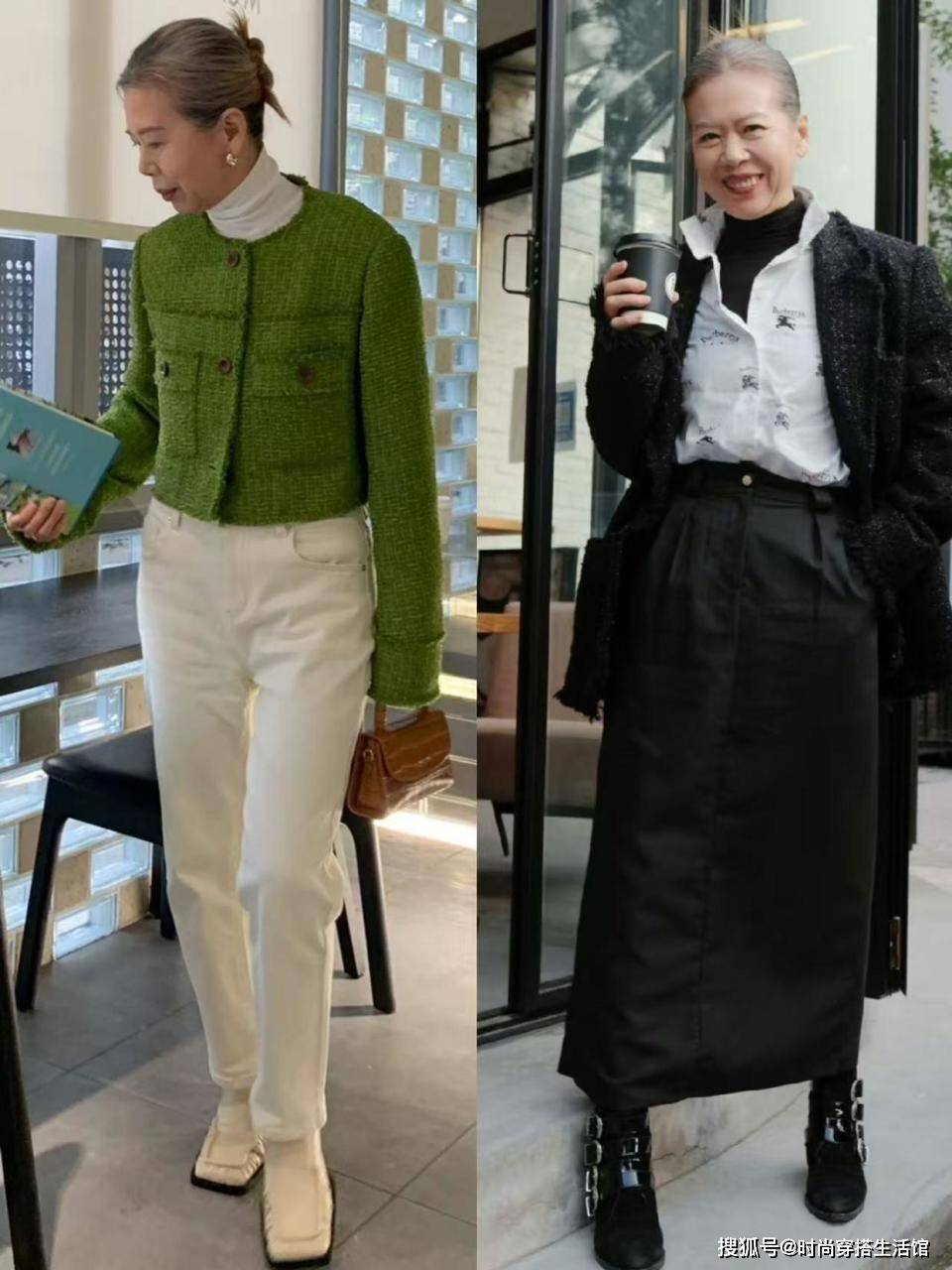 说到格纹元素的外套,其实我们可以联想到“程序员标配”,这种争议性很大的元素五六十岁女人穿在身上的话就很难逃出土气感。