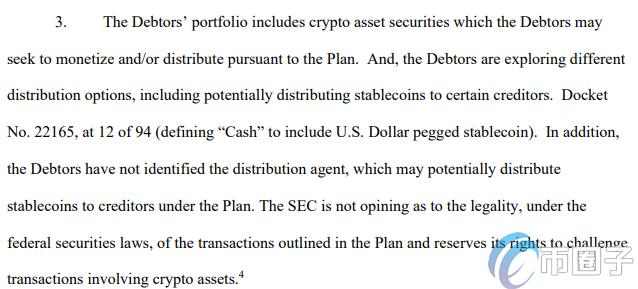 文件中提到,根据FTX提交的重组计划(案号22165,第12页),其定义的“现金”包括与美元挂钩的稳定币。不过,FTX尚未确定分销代理,该代理可能会根据该计划向债权人分发稳定币。
