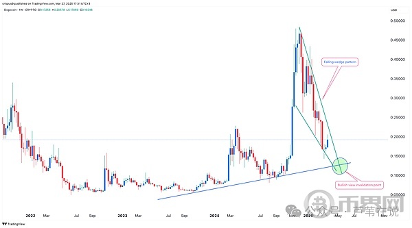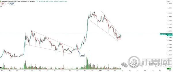 这位分析师研究了狗狗币的周线图,发现它正在形成一个“下降楔形”形态(简单来说就是价格波动逐渐收窄)。有趣的是,去年3-11月也出现过类似的形态,随后狗狗币价格一路上涨至0.45美元。现在,历史可能会重演!