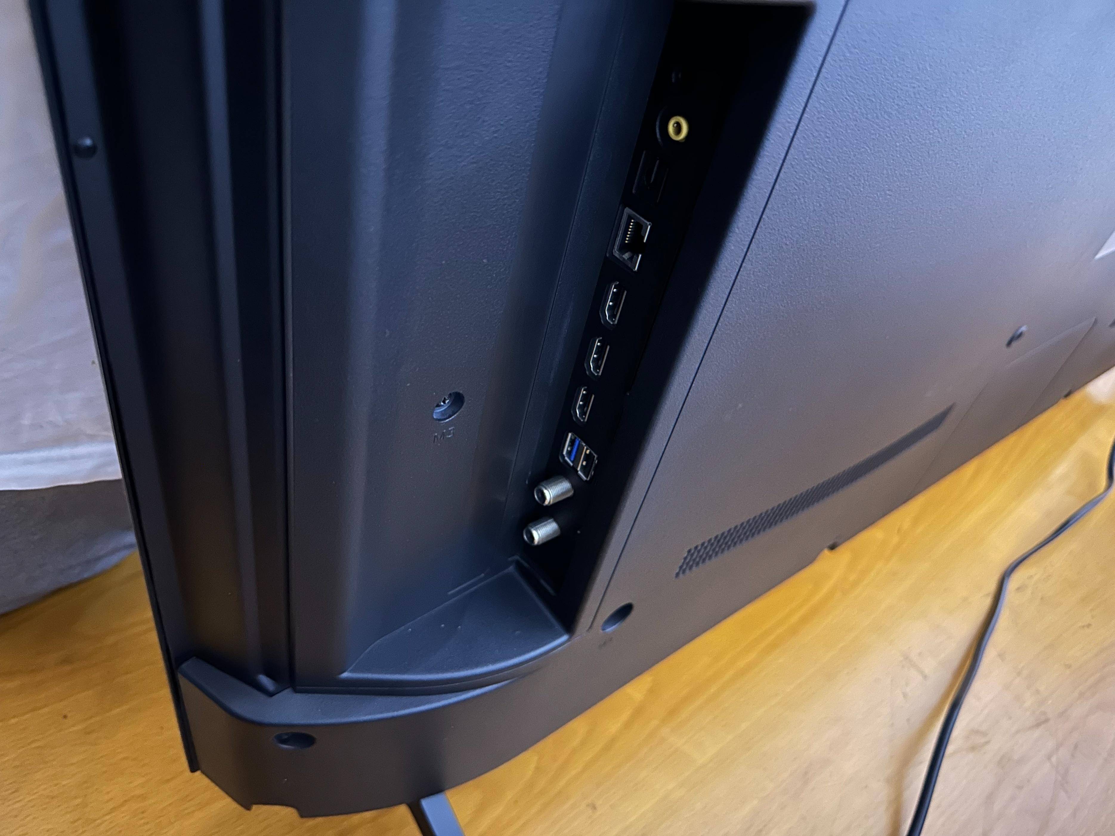 这款电视的接口在电视右方,包括了三个HDMI 2.0接口以及两个USB接口,其中一个是USB 3.0,同时还有一个百兆网口和3.5mm音频输出口。有意思的是,其中第二个HDMI支持ARC/eARC功能,也就是如果接驳同样支持eARC的回音壁或者功能,可以直接回传完整的杜比全景声音频格式。