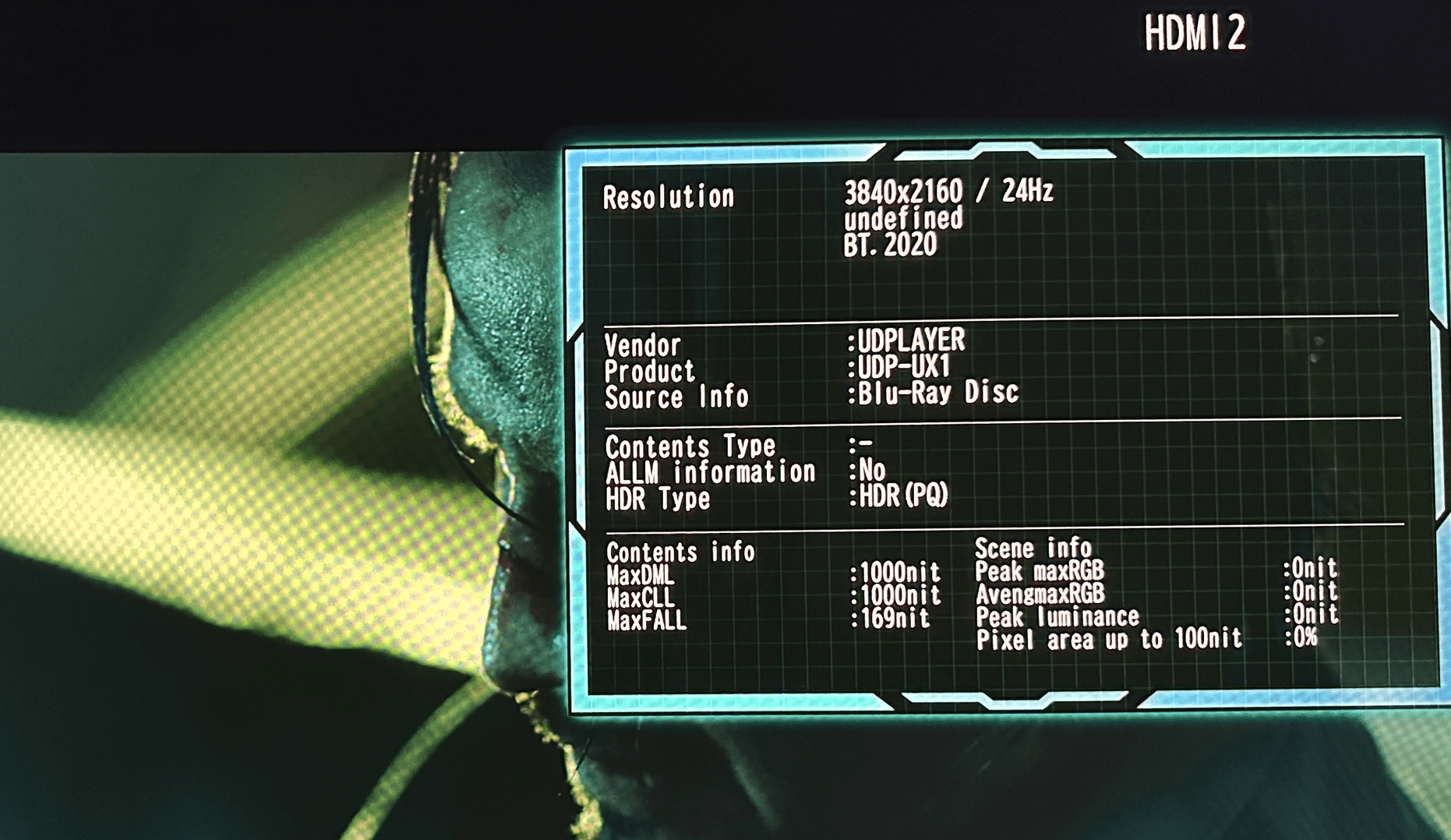 这里就要说松下LX 800的一些让我们觉得有意义的功能了。松下LX 800可以通过遥控板上的信息键,了解到目前的分辨率和刷新率;如果长按信息键,则可以展现更详细的视频信息,除了分辨率和刷新率之外,还有色域、播放设备信息、HDR信息、视频亮度信息和实际映射信息。当然有一些信息无法准确读出,而且具体视频的信息,似乎只对HDMI输入设备有意义,播放流媒体我们发现没有什么用处。