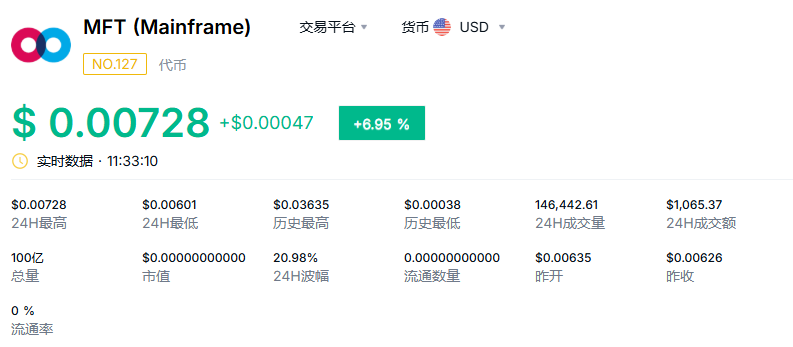 截至2025年1月10日,MFT币的价格约为0.00728美元,24小时内最高价为0.00728美元,最低价为0.00601美元,交易量为146,442.61MFT,成交额达1065.37万美元。MFT币的历史最高价为0.03635美元,最低价为0.00038美元。它于2020年3月26日发行,初始价格为0.003美元,总发行量为100亿MFT。