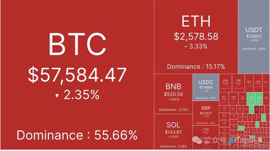 在早盘时段,比特币多头一度将价格推高至60,000美元,但随后价格迅速走低,午盘时段急速下跌4.7%,跌至8月初市场恐慌以来的最低水平。截至发稿时,比特币的交易价格为57,584美元,24小时跌幅为2.35%。