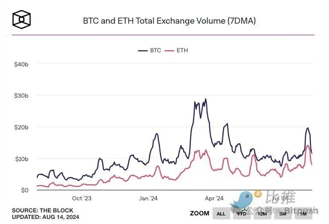 The Block的数据显示,过去一周,比特币交易量的七天移动平均值已从196.2亿美元下降至115亿美元。包括币安和Coinbase在内的主流交易所的现货市场总交易量的七天移动平均线也从上周四的600多亿美元下降至目前的360多亿美元。