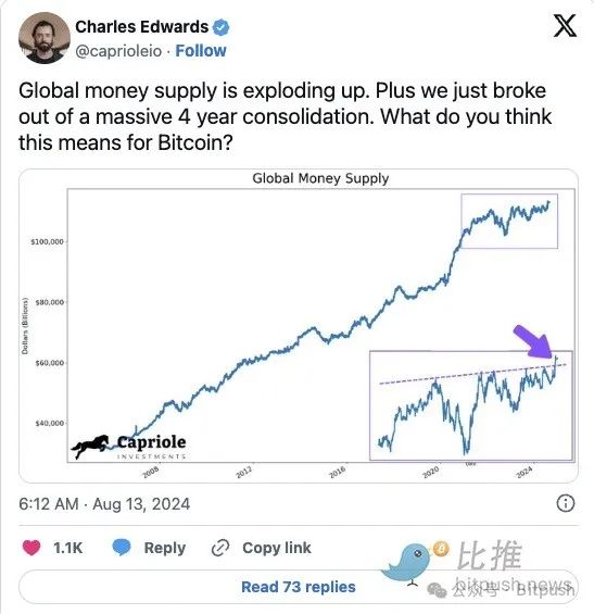 对于助力加密牛市的催化剂,Capriole Fund创始人Charles Edwards在X平台指出:“爆炸式”的全球货币供应量。
