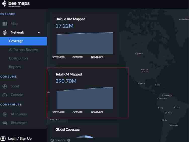 在我们深入探讨这次合作之前,先来看看Hivemapper的发展历程。Hivemapper是一个基于Solana区块链的去中心化地图网络,自2022年11月推出以来,发展速度惊人。在短短两年内,它已经绘制了全球29%的道路地图。通过创新的"Bee"行车记录仪和AI技术,Hivemapper每月能够捕获超过2800万公里的街道级图像,增长速度是Google街景的5倍。根据Bee Maps的官方数据,Hivemapper已经完成了超过3.9亿公里的去中心化地图绘制工作。