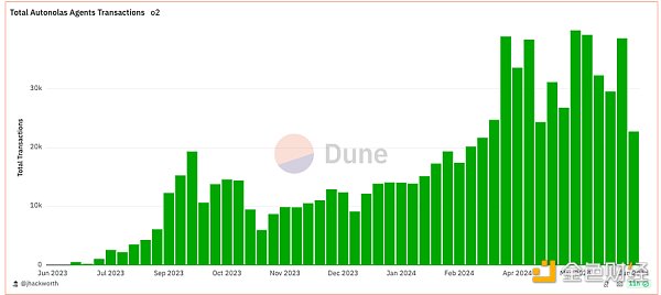 大部分链上交易将由AI智能体来完成。这一趋势在Autoolas的预测市场智能体中表现得非常明显。自今年年初以来,智能体交易量增长了两倍,过去一个月里,周交易量超过38k,并且,大约63%的交易为Gnosis Safe交易。
