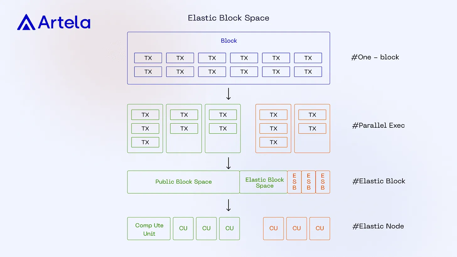 Artela的弹性区块空间(EBS)基于弹性计算概念设计而成,能够根据网络拥堵程度自动调整区块容纳的交易数量。