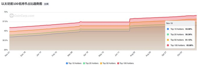 从数据上看,这种观点似乎得到了验证。在过去的一年里,前100个持币地址的市场占比逐渐上升,现在已经达到了66%。特别是在ETH ETF批准上市后,这一比例有了显著的增加。这表明ETH的持有集中度在不断提高。虽然头部地址一直在买入,但ETH的价格却没有上涨,这说明了什么呢?